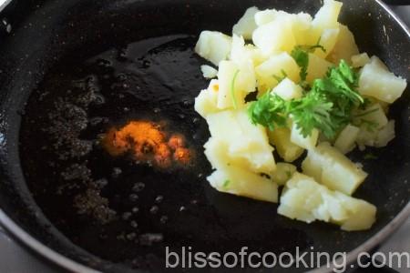 - Heat oil in a pan; add mustard, turmeric, salt, potatoes and coriander.