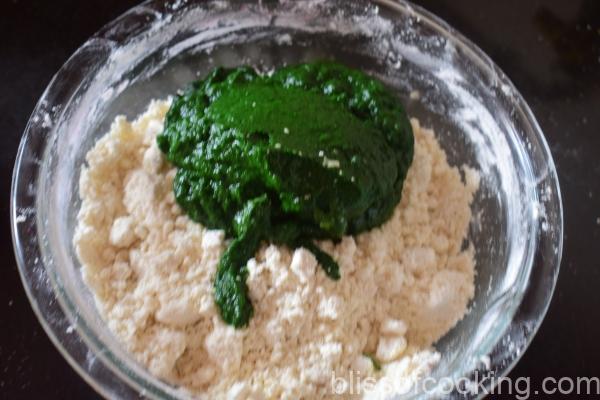 - Combine 2 cups maida, 3 tablespoon oil and salt. Rub with your fingertips. Add the palak puree and make a soft dough. Most probably you will not need any water. If required add 1 or 2 tablespoons of maida to get the right dough.