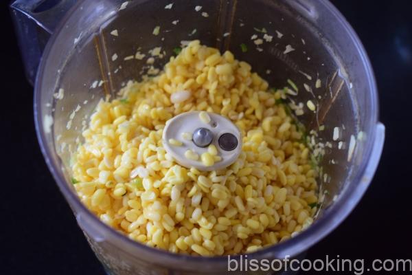 - Add dal, green chillies, ginger to a blender and grind to a coarse paste.