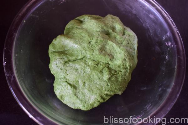 - Knead the palak (spinach) dough and make 2 big balls.