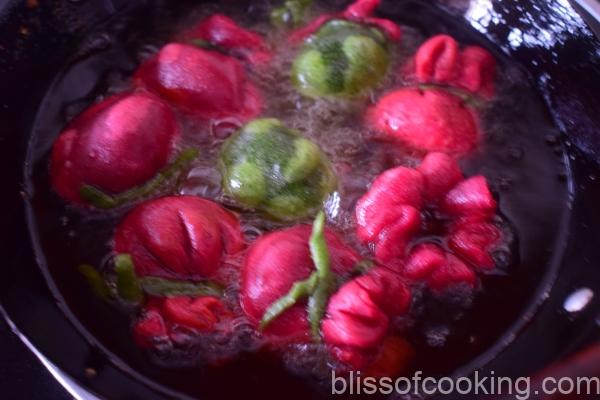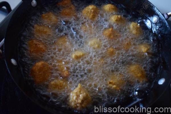 - Heat oil on medium heat; add the potli’s; and when the potli’s are puffed up, then reduce the heat and fry till crisp.