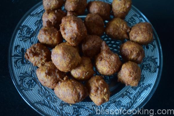 - Heat oil for frying on medium heat, make small size pakoras by dropping the batter by a teaspoon or by hand. Fry till golden and crisp.