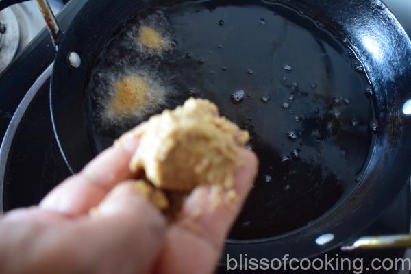 - Heat oil for frying on medium heat, make small size pakoras by dropping the batter by a teaspoon or by hand. Fry till golden and crisp.