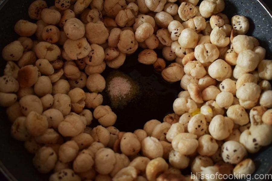 • Now make some space in the center of the pan; add ghee, salt, pepper and stir the makhana so that they are quoted well.