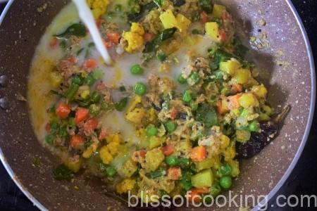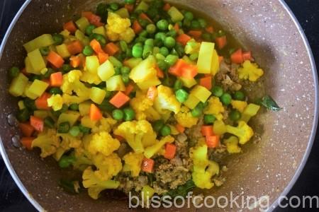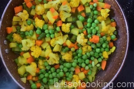 • Add 1 cup water and cook till the vegetables are cooked. Adjust the seasoning and consistency as per your taste.