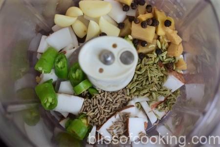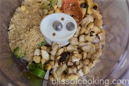 • Grind all the ingredients for the paste in a blender to a fine paste by adding just enough water for it to grind.