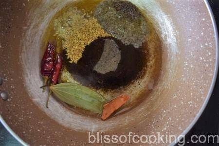 • Heat oil in a pan, mustard, add cumin, bay leaves, cinnamon, dry red chilli, hing, curry leaves and toss.