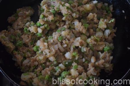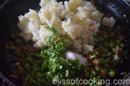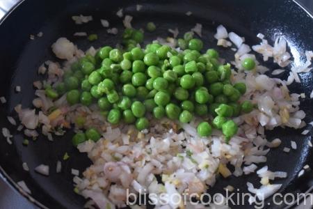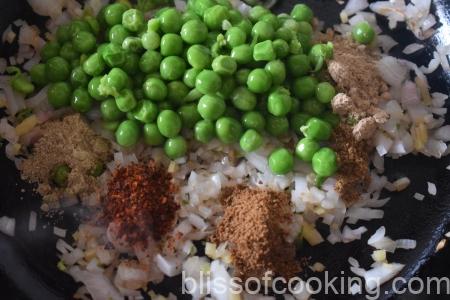 • Add green peas, red chilli powder, cumin powder, chat masala, garam masala, amchur and saute for a minute till all the masalas are roasted well. Switch off the heat.
