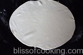 - Dust the surface with flour and roll into 7” diameter tortilla.