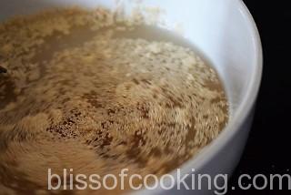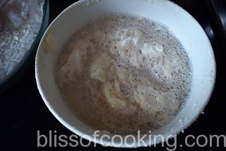 - In a bowl add warm water, sugar, yeast and mix well. Cover and let it rest for 10 minutes, till it is frothy.