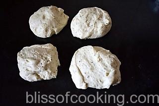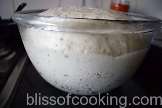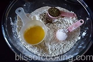 - In a large bowl add maida, salt, herbs, half the oil, and above mentioned yeast mixture.
