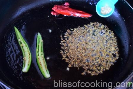 • Heat oil in a pan, add cumin seeds, when seeds turn golden, add asafoetida , bay leaf, dry red chilli and green chilli.