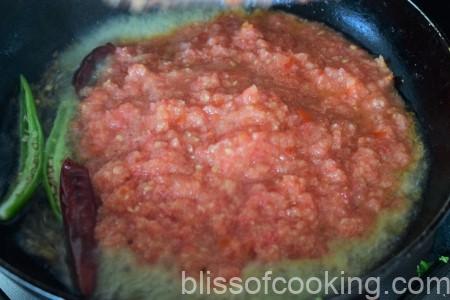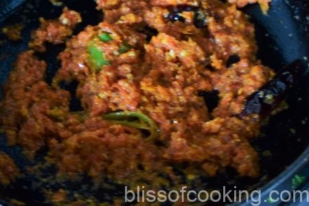 • Add the ginger, tomatoes and sugar, sauté till the tomatoes are mushy and oil starts to separate.