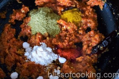 - Add the ginger, tomatoes and sugar, sauté till the tomatoes are mushy and oil starts to separate.