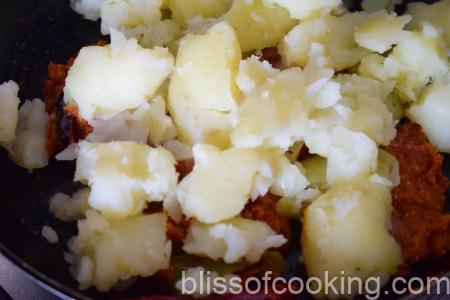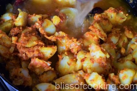 • Add the potatoes and sauté till well coated with the masala.