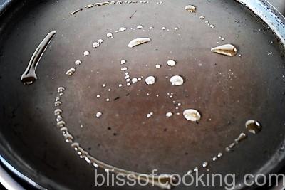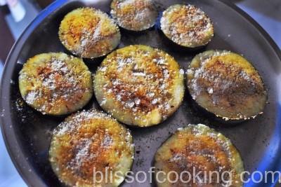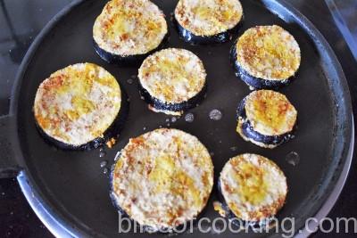 - Heat 1 teaspoon oil in a pan and shallow fry the baigan slices on both the sides by adding more oil as required.