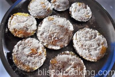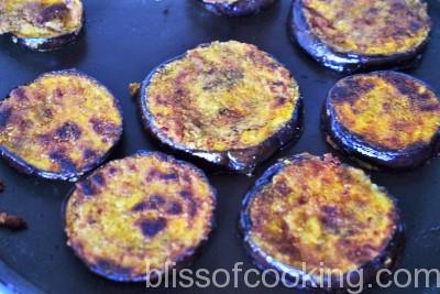 This preparation of Baigan Bhaja is an easy recipe and tastes yummy. Many recipes call for frying but I prefer to pan fry, as Brinjal absorbs a lot of oil while frying.