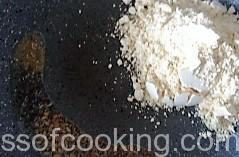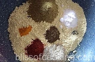 • Heat 1 spoon oil in a pan; add mustard, cumin, sauf, methi, hing and add in the besan.
