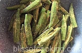 • Heat 2 tablespoon oil in a pan; add the stuffed Bhindi’s and sauté for 2 minutes cover and cook on low heat for 3 to 4 minutes.
