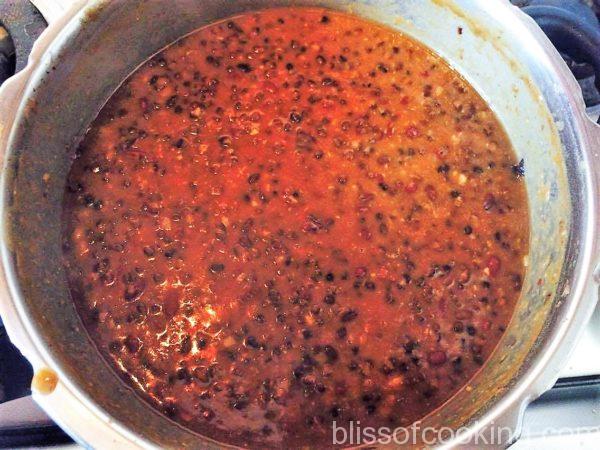 - Cook on medium heat till the first pressure is released. Now lower the heat and cook for 20 minutes or 4 to 5 whistles.