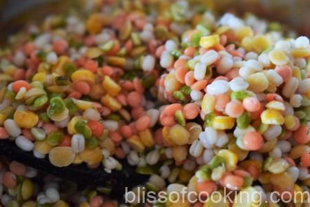 Dal Panchmel recipe has a mix of five lentils. I have sauteed the onions and the daal before boiling to enhance the flavor and to get a creamy consistency.