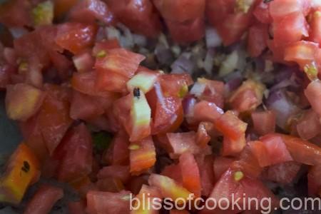 • Add the ginger garlic paste and stir, then add the tomatoes and stir till there is no moisture left.