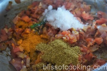 • Now add the turmeric, coriander and 1/4 teaspoon chilli powder. Stir for a minute.