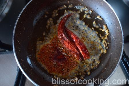 • Switch off the heat and add red chilli powder and pour immediately on the daal.
