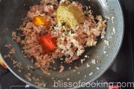 - Heat the 2 tbsp oil in a pan, add cumin and then add the onions.
