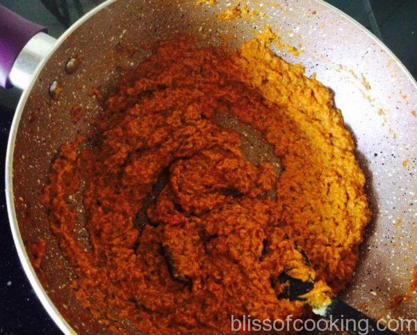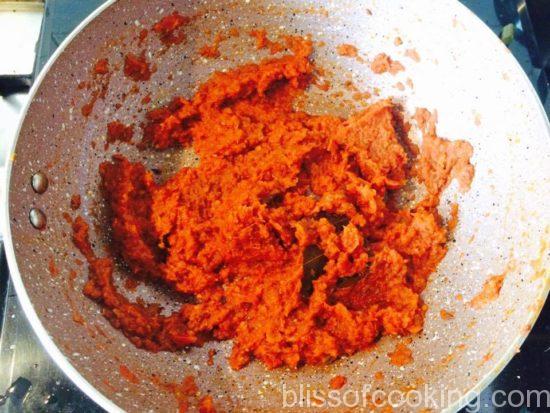 • Add the tomato puree and fry till oil starts to separate.
