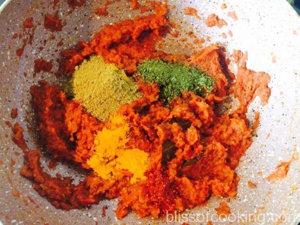 • Rub the dry kasoori methi to crush a little and add to the onion paste.