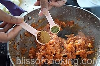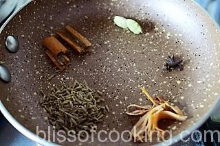- Dry roast all the 5 spices on low heat for 3 minutes. Cool and grind to a powder. Set aside.