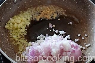 - Heat oil and ghee in a pan, add ginger, garlic and onions, sauté till translucent.