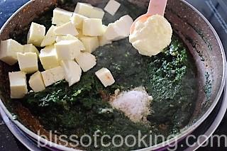 - Add the cream, stir and add the paneer pieces and salt. Cook on low heat for 3 to 4 minutes.
