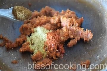 - Heat oil in a pan. Now add the onion paste. On low heat saute the paste till golden brown.