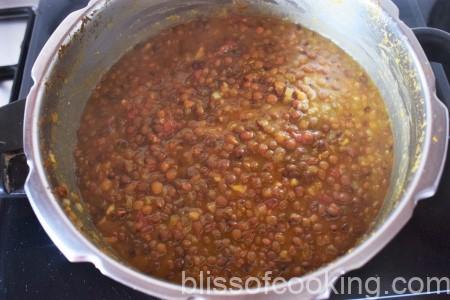 • Pressure cook masoor dal with all the ingredients for dal and 3 cups of water. After one whistle lower the heat and cook for 20 minutes.