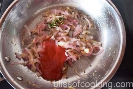 • Add tomato puree and kasoori methi and stir for 2 minutes.