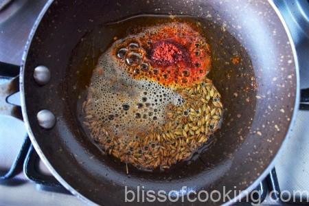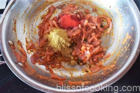 • Add the red chili powder, coriander powder, mix well.
