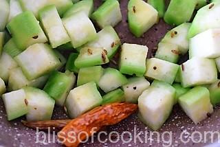 - Heat ghee; add jeera, dry red chilli, hing, tori and saute for 2 minutes.