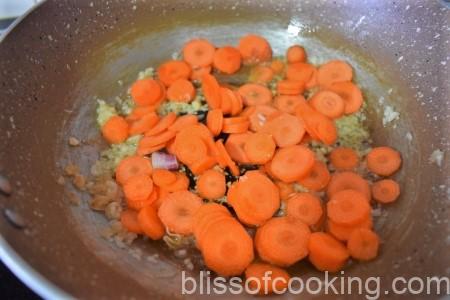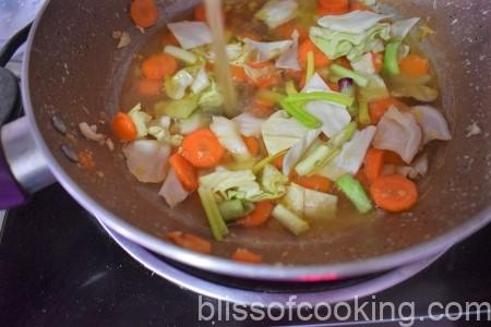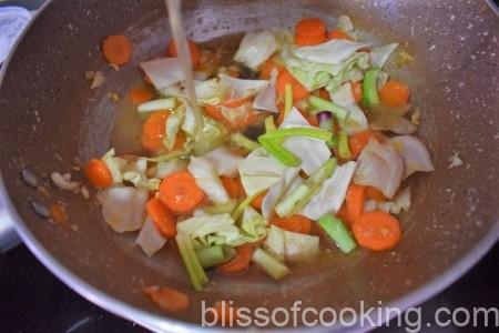 - Stir and add carrot and baby corn. Stir for 2 minutes and then add the cabbage.