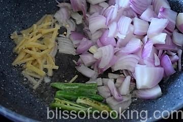 - Now add 1 tablespoon oil, add the onion, ginger and green chilly and saute for a few seconds.