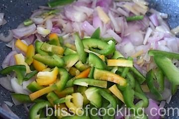 - Add capsicum, stir for a few minutes. Take care not to over cook the vegetables.