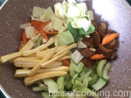 - Now add the baby corn, cabbage and mushroom and saute for 2 minutes.