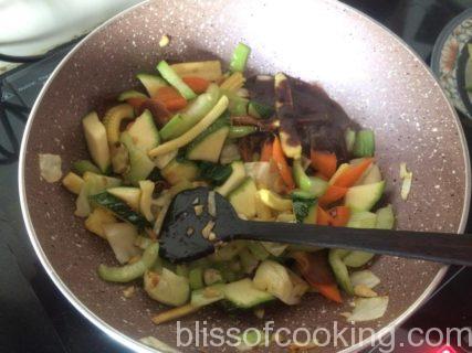 Note: Cut the vegetables uniformly so that they cook at one time. Keep all the vegetables and other ingredients ready before putting the heat on.