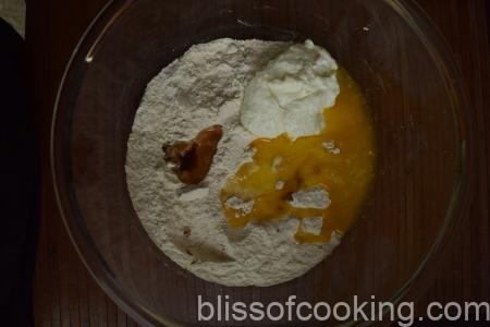 - Add yoghurt, vanilla, melted butter, yeast mix, vinegar milk and stir to just combine everything together.