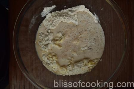 - In a bowl add milk, yeast, sugar and stir to mix. Cover and set aside for 10 minutes for it to be frothy.