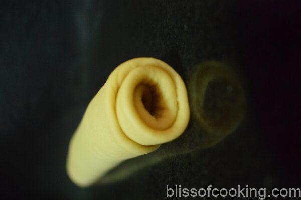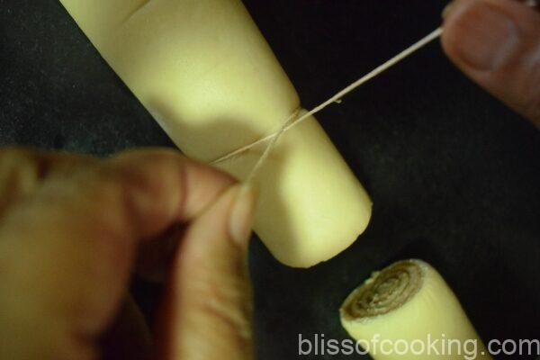 - Roll it up from the longest side, roll tightly but not too tight. Pinch the seam tightly and cut into 12 equal-sized rolls (feel free to measure and cut each roll to be 2″ long).