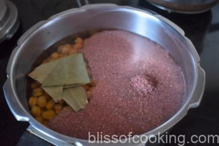 - In a pressure cooker transfer soaked chick peas, channa dal, salt, anardana, bay leaves, and water. Cook till tender.