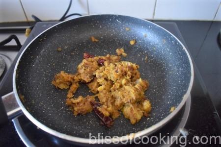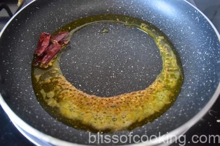 - Heat oil in a pan; add cumin, red chillis. Sauté the masala till oil leaves the sides.