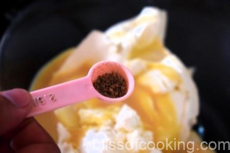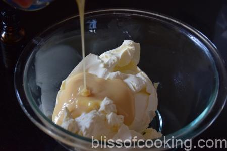 • With a hand blender blend together cream cheese, condensed milk, cardamom powder and saffron milk together.
